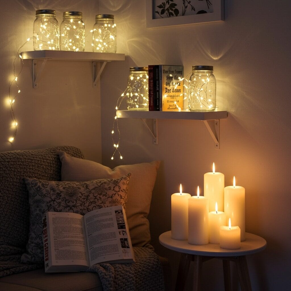 Candles add warmth and intimacy that electric lights can’t match. Group candles of different heights together, but stick to the same color family – all white, all cream, or all natural beeswax creates cohesion.