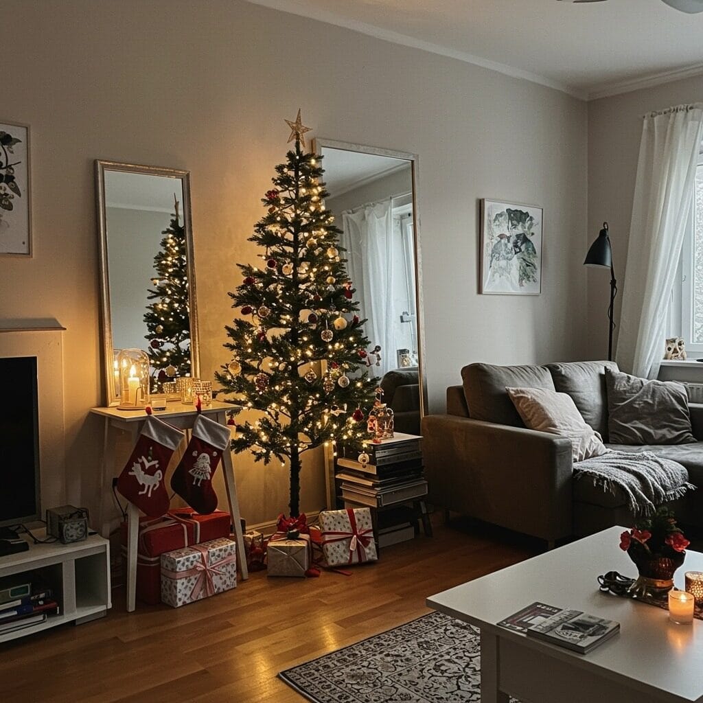 Small spaces actually lend themselves beautifully to minimalist Christmas decor because there’s less room for clutter anyway. Focus on vertical elements like a tall, narrow tree or garland hung at ceiling level to draw the eye up.