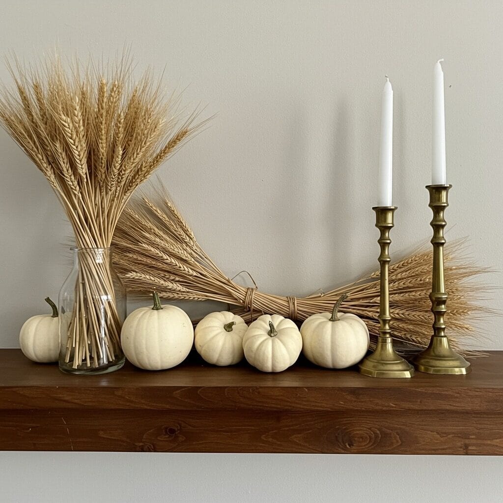Pumpkins don’t have to be bright orange to make an impact. White, cream, and even deep sage green pumpkins create a more refined seasonal display. Group them in odd numbers and vary the heights – some on books, others directly on surfaces. This creates that layered look that feels intentional rather than just “plunked down.”