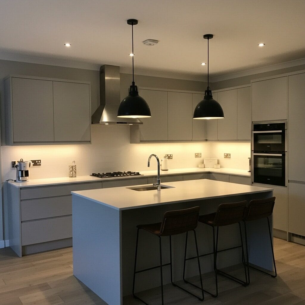 Start with task lighting for work areas, then add ambient lighting for overall illumination, and finish with accent lighting to highlight architectural features. Pendant lights over islands serve as both functional and decorative elements, while under-cabinet lighting eliminates shadows on work surfaces.