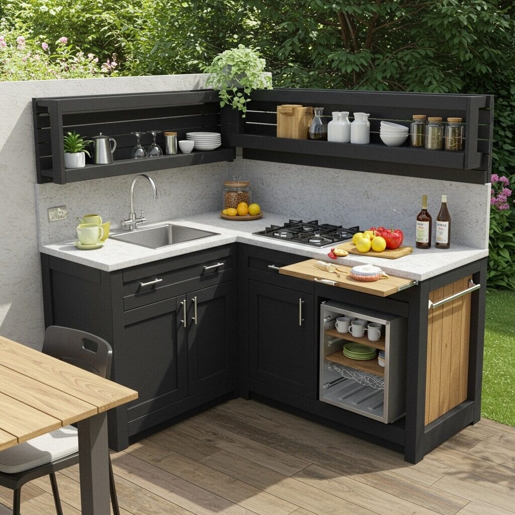 Vertical storage becomes your best friend in compact designs. Wall-mounted cabinets, magnetic knife strips, and hanging pot racks keep everything organized without taking up precious counter space. Consider fold-down prep surfaces or rolling carts that can provide extra workspace when needed and tuck away when not in use. This flexible approach makes your small backyard patio makeover both functional and stylish.
