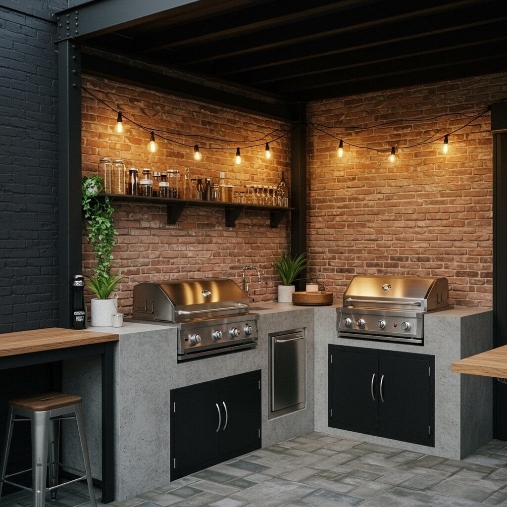 For those who love urban aesthetics, an industrial chic outdoor kitchen patio brings city sophistication to your backyard. Black metal frameworks, exposed brick, concrete surfaces, and Edison bulb lighting create a space that’s both edgy and welcoming.