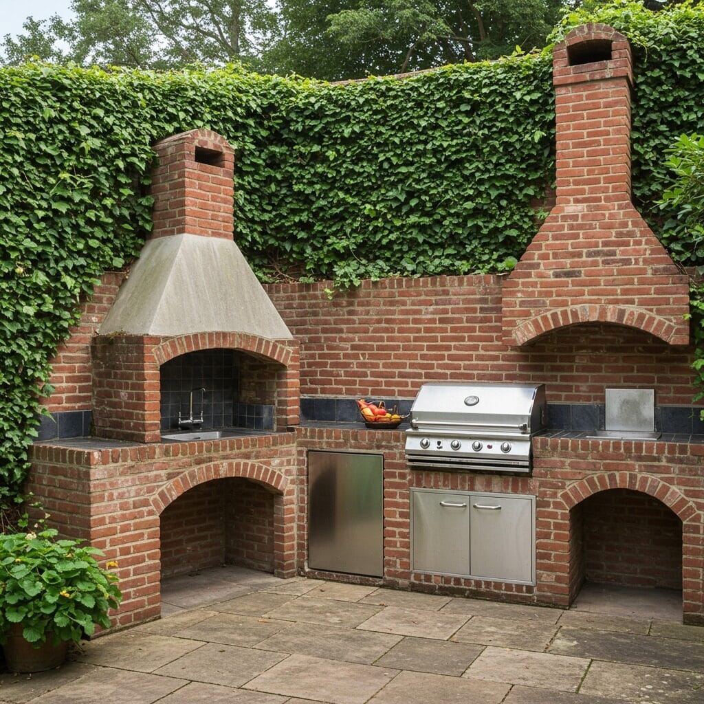 Consider incorporating climbing vines or ivy to soften the hard edges of the brick work. This natural element adds visual interest and helps blend your outdoor kitchen seamlessly into the landscape.