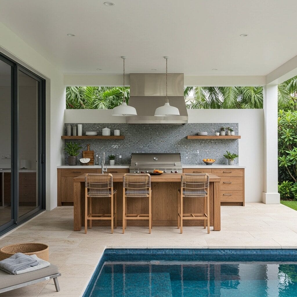 The proximity to the pool makes entertaining effortless – guests can enjoy a refreshing swim while you prepare delicious meals just steps away. Choose materials like sealed stone or marine-grade stainless steel that can handle the moisture-rich environment.