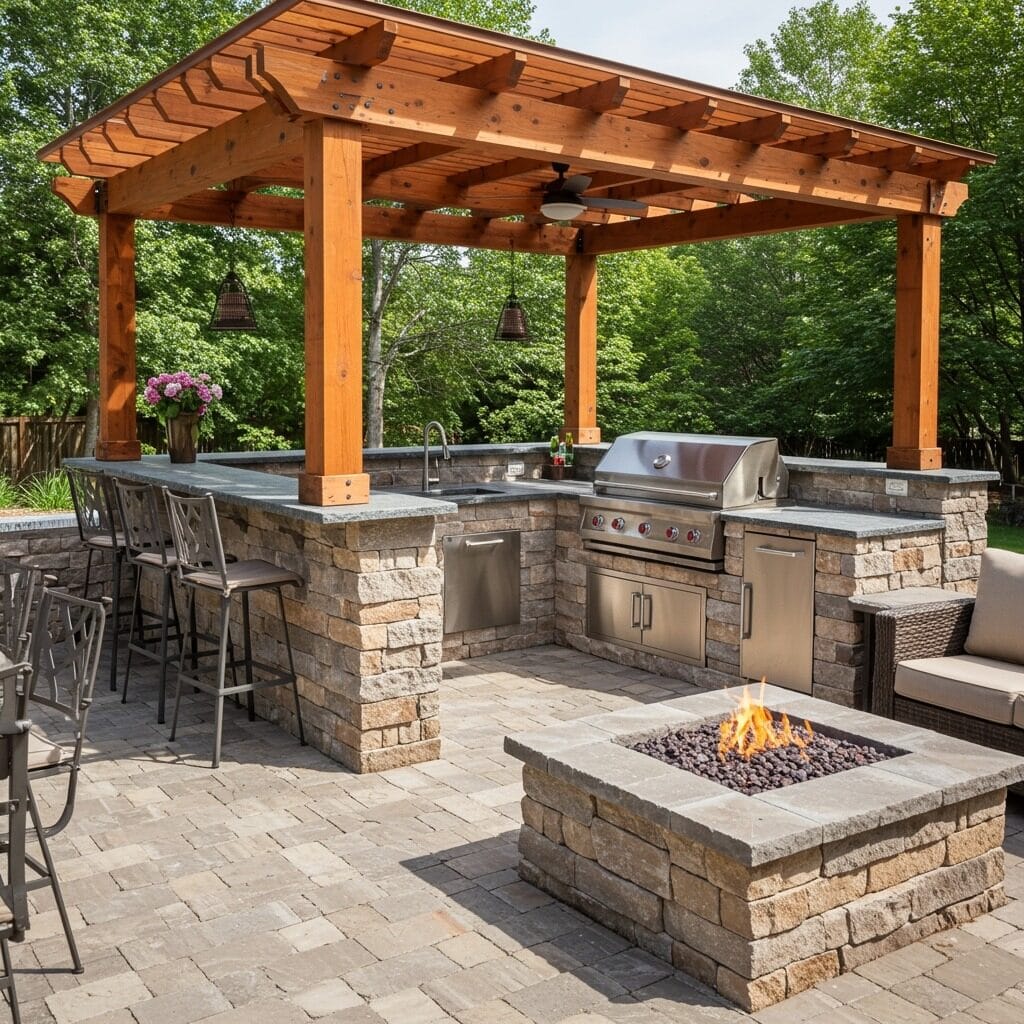 A pergola-covered outdoor kitchen patio provides the perfect balance of protection and open-air cooking. The overhead structure offers some shelter from sun and light rain while maintaining that outdoor cooking experience you crave.