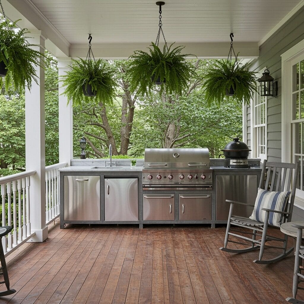 Embrace Southern hospitality with an outdoor kitchen patio that channels classic porch living. Wraparound porch elements, comfortable rocking chairs, and hanging ferns create a space that invites lingering and storytelling over good food and sweet tea.