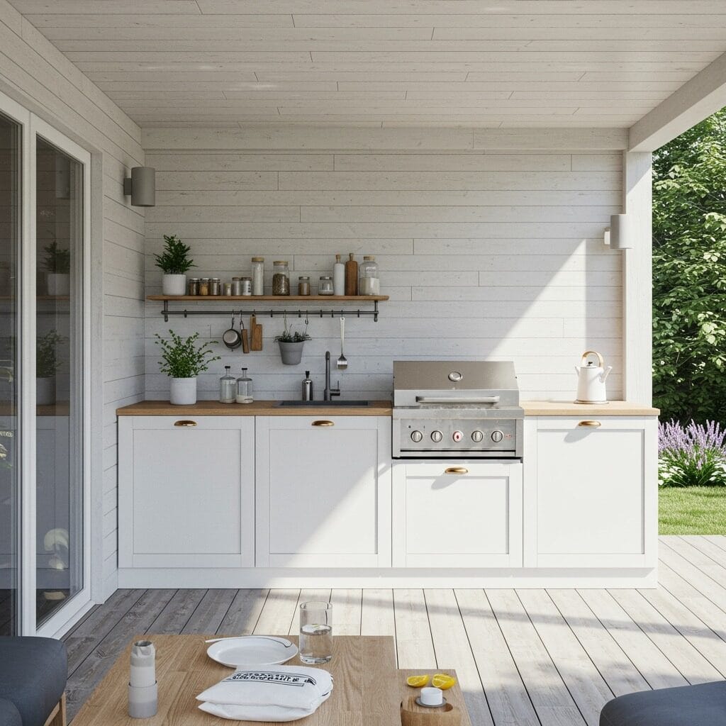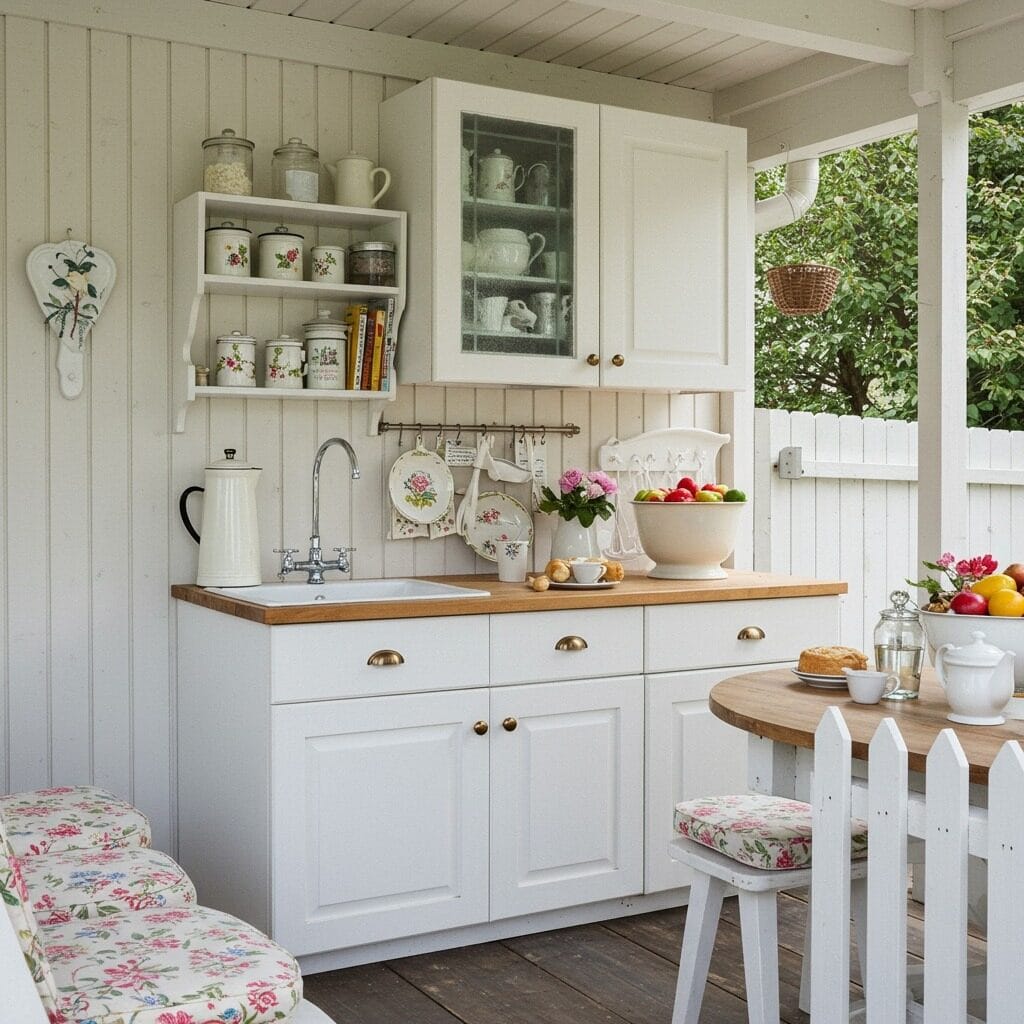 Bring cottage charm to your outdoor cooking space with soft colors, vintage-inspired accessories, and plenty of personality. White or pastel-painted cabinets, floral cushions, and decorative details create a welcoming space that feels like an extension of a cozy country kitchen.