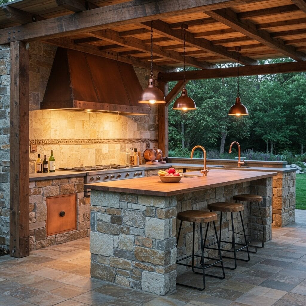 There’s something magical about cooking with natural materials that connect you to the earth. A rustic stone and wood outdoor kitchen patio brings warmth and character to your backyard cooking area. Natural stone countertops, wooden pergolas, and copper accents create an inviting atmosphere that feels both timeless and cozy.