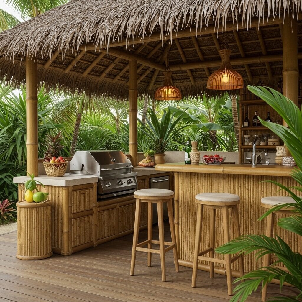 Why not bring vacation vibes to your daily life? A tropical-inspired outdoor kitchen patio creates a resort-like atmosphere that makes every meal feel like a celebration. Bamboo accents, natural wood finishes, and lush tropical plants transform your backyard into an island paradise.