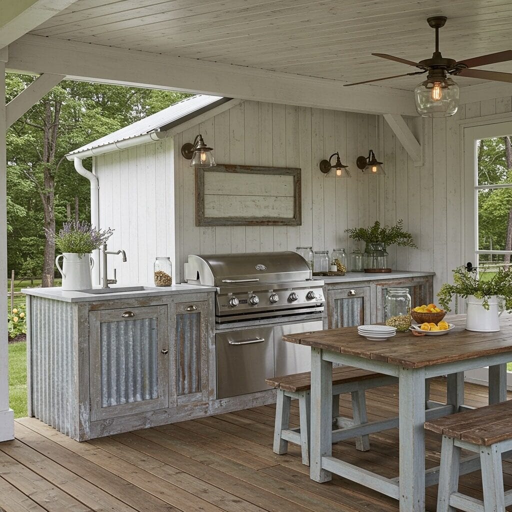 Channel your inner farmer with an outdoor kitchen patio that celebrates agricultural heritage and country living. Shiplap siding, galvanized metal accents, and vintage-inspired accessories create a space that feels both nostalgic and fresh.