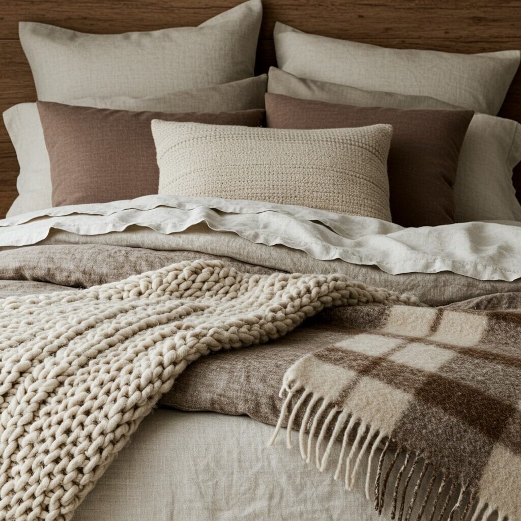 Rustic bedrooms thrive on texture, and layering different natural fabrics creates that coveted cozy factor. Start with linen or cotton sheets in neutral tones, then add a chunky knit throw in cream or oatmeal. Wool blankets, especially those with subtle plaid patterns, bring warmth both visually and literally.