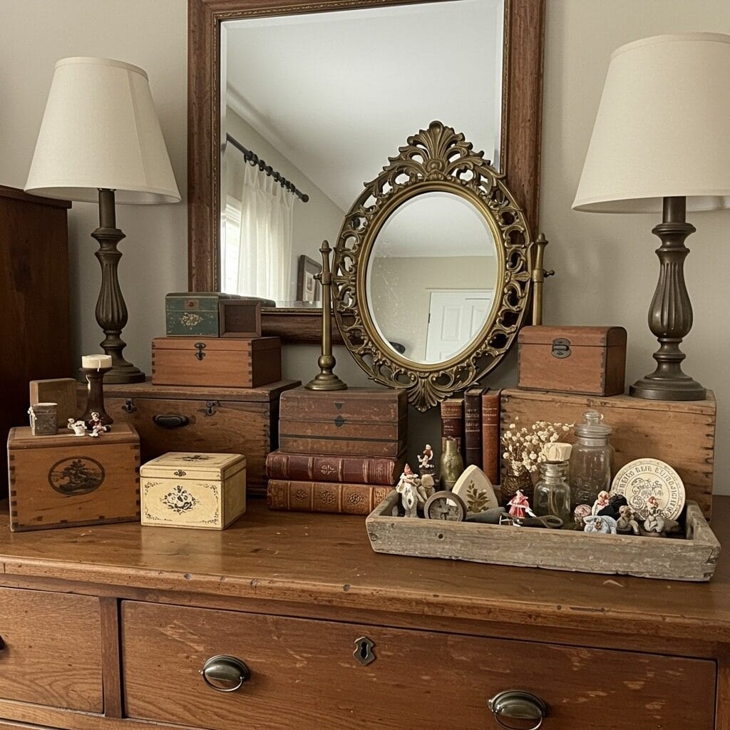 These pieces work both as decoration and storage. A vintage trunk at the foot of your bed provides extra storage while serving as a design element. Old wooden boxes can organize smaller items on your dresser while adding visual interest.