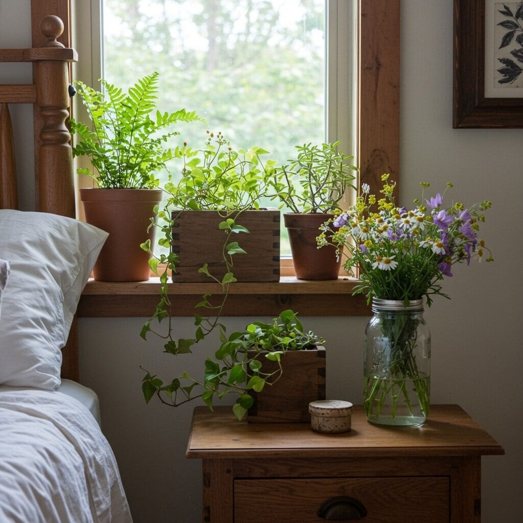 Plants breathe life into rustic bedrooms while reinforcing the connection to nature. Choose varieties that thrive in bedroom conditions – snake plants, pothos, or peace lilies all work well in lower light situations.