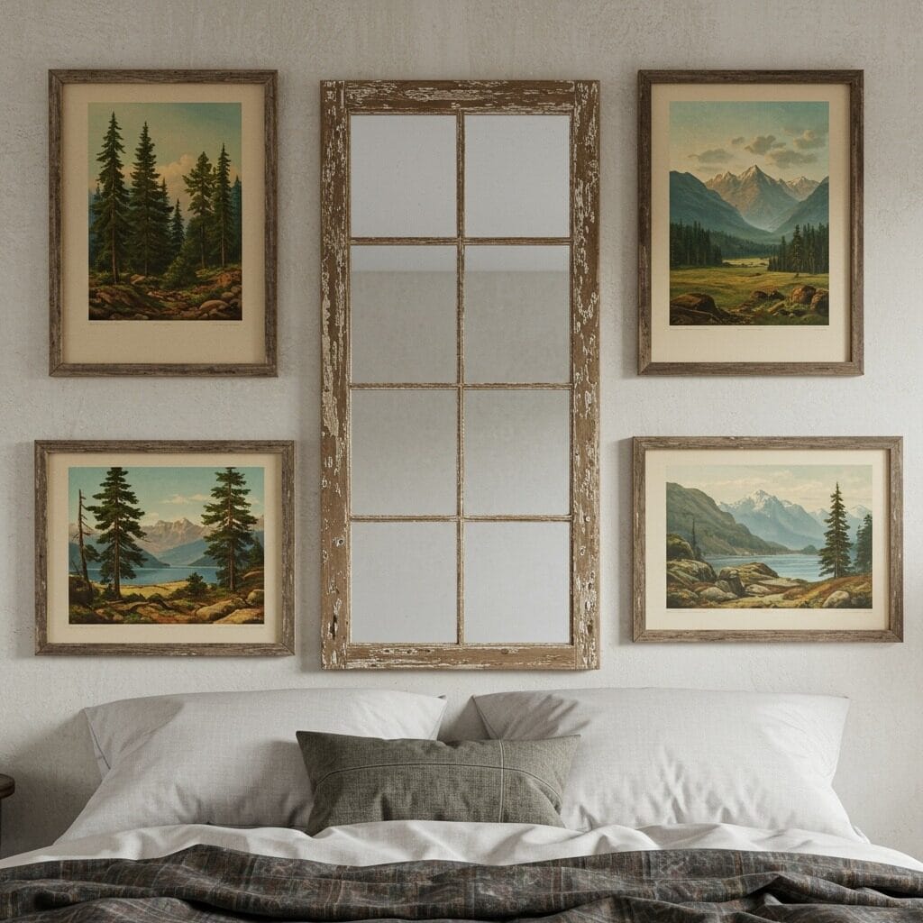 Mirrors with weathered or distressed frames reflect light while adding functional beauty. An antique window frame converted to a mirror creates a stunning focal point with authentic character.