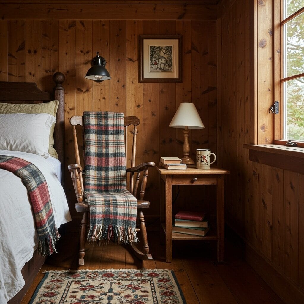 Every rustic bedroom benefits from a dedicated cozy corner where you can unwind with a good book. This doesn’t require tons of space – even a simple wooden chair with a soft throw and side table can create an inviting retreat within your bedroom.