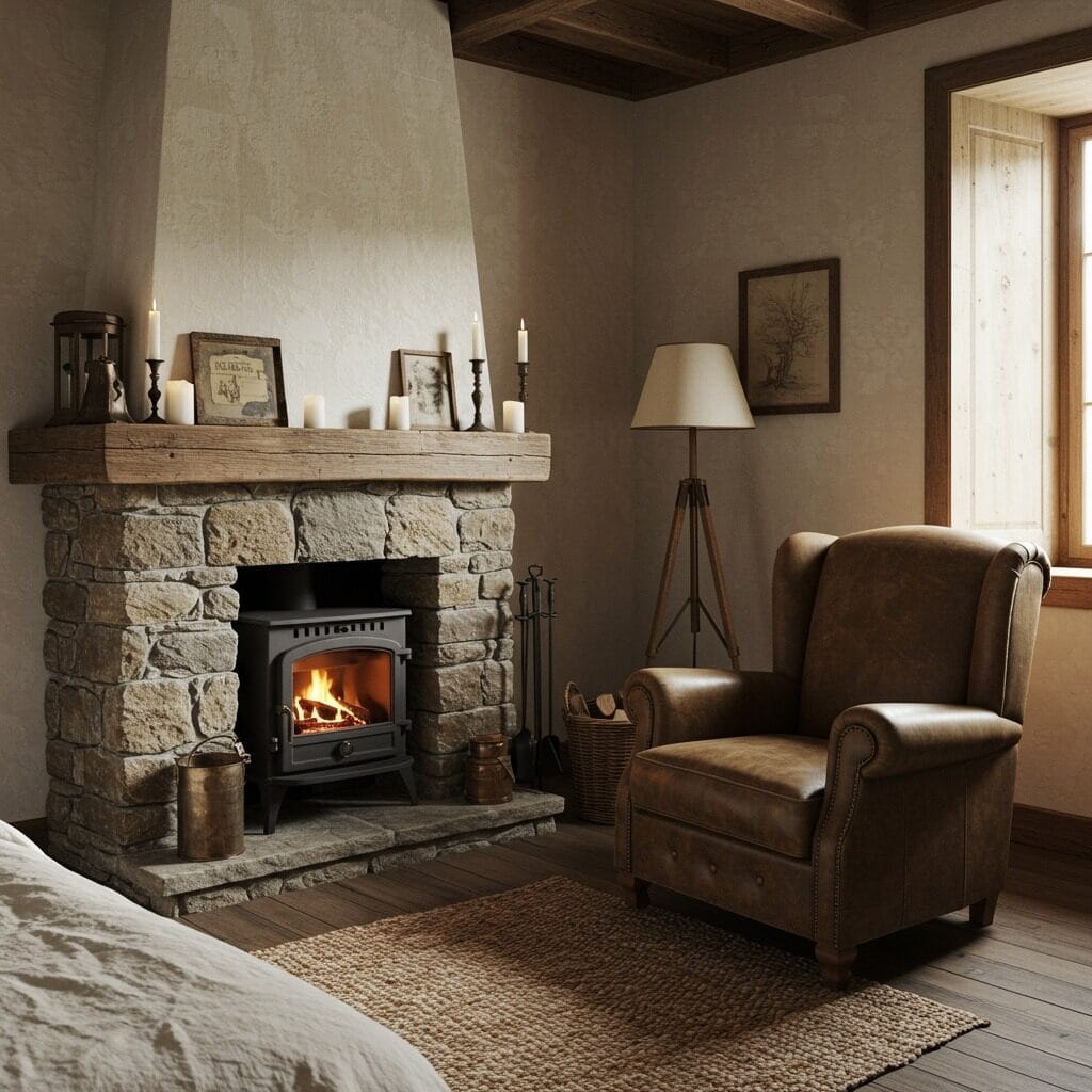 Nothing creates rustic ambiance quite like a fireplace. If your bedroom has space for a fireplace insert or you’re building new, this feature instantly transforms the space into a cozy retreat. The flickering flames and warm glow complement the natural materials beautifully.