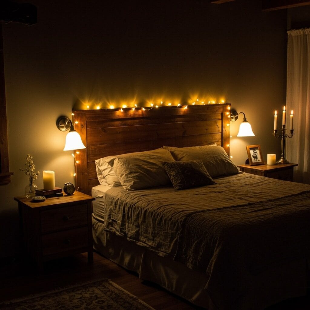 Bedroom lighting ideas for rustic spaces focus on creating warm, inviting ambiance rather than harsh overhead lighting. Table lamps with fabric shades, string lights, and candles all contribute to the cozy atmosphere.