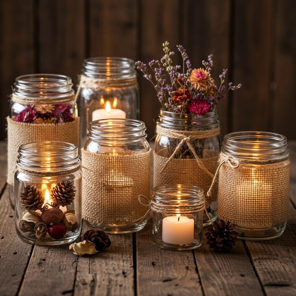 Consider wrapping some jars with burlap and twine for added texture. The combination of glass, natural materials, and soft candlelight creates exactly the cozy fall home decor atmosphere you’re after.
