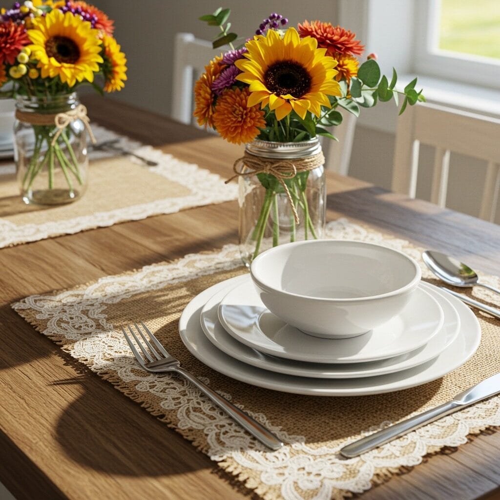 Combine the rustic texture of burlap with delicate lace for place settings that feel both casual and elegant. Burlap placemats paired with lace napkin rings create a beautiful contrast of textures that guests will love.