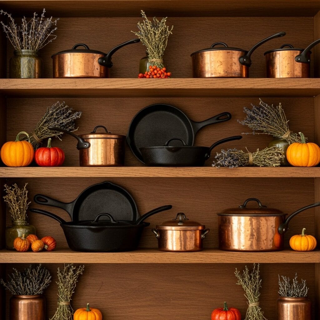 Don’t hide your beautiful cast iron and copper pieces during the holidays – display them as part of your cozy fall home decor! These functional items double as stunning rustic decorations that add authenticity to your harvest theme.