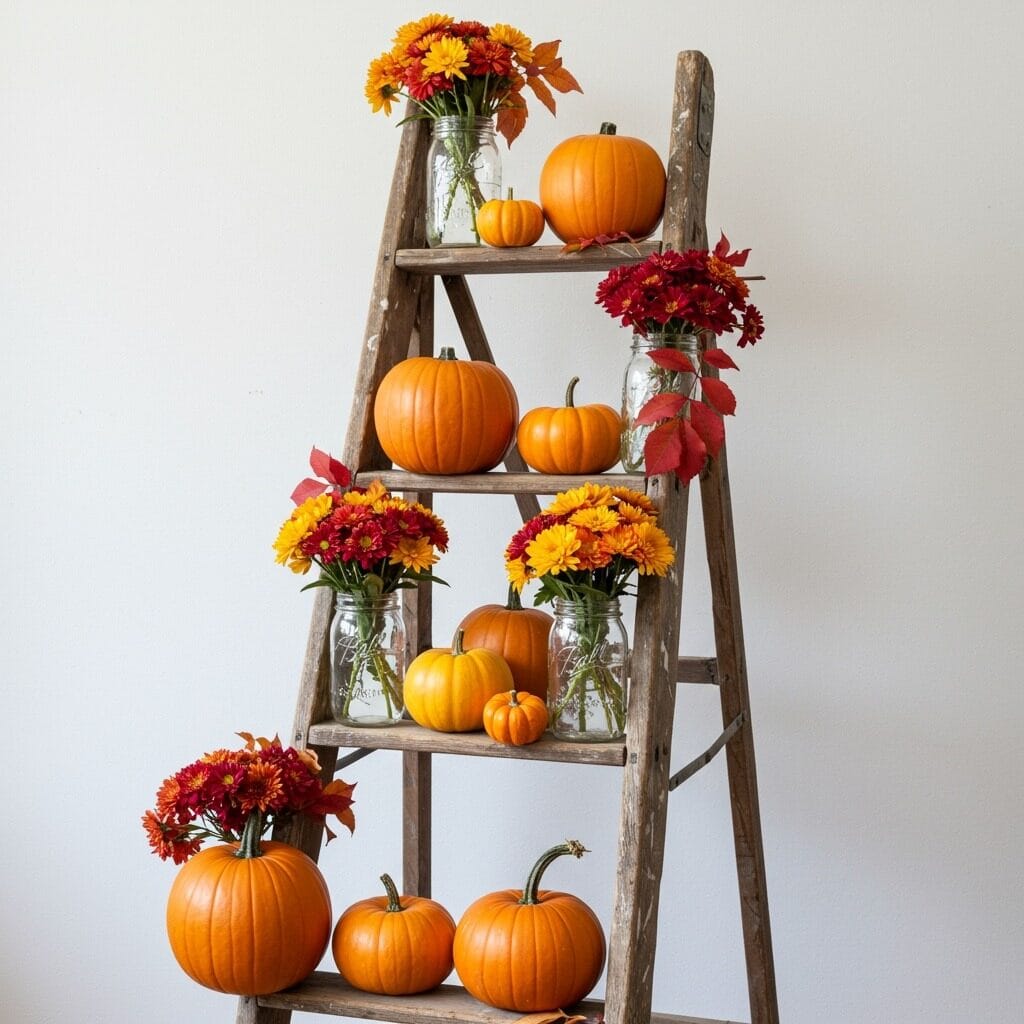 An old wooden ladder makes an incredible vertical display for your rustic Thanksgiving decor. Lean it against a wall and use the rungs as shelves for pumpkins, candles, and autumn foliage. This creates height and draws the eye upward.