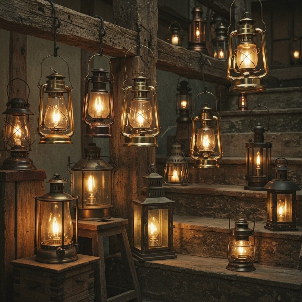 Group lanterns of different sizes and finishes for visual interest. Mix brass, black metal, and weathered finishes to create depth in your lighting display. Place them on the floor, tables, or hang them from shepherd’s hooks outdoors.