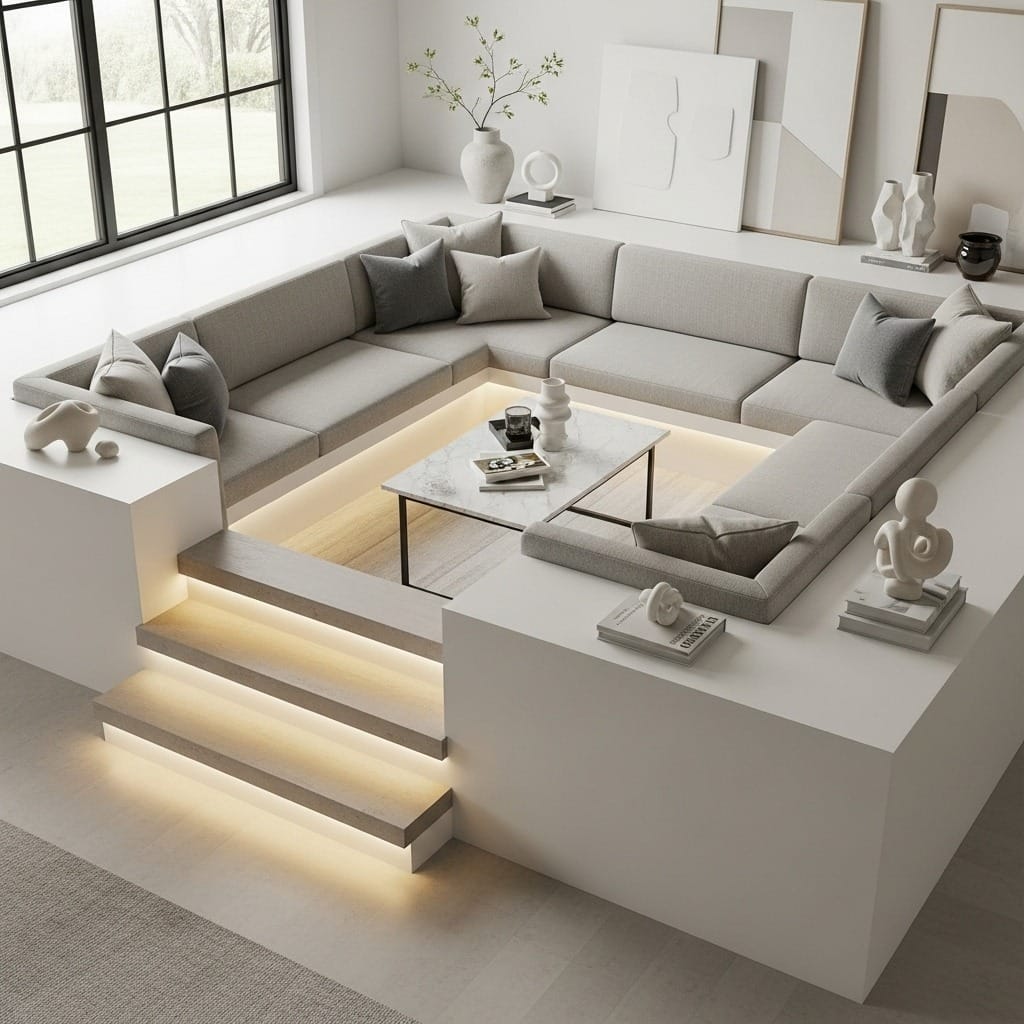 If you love the concept but can’t commit to permanent construction, several alternatives create similar intimacy without the architectural commitment. Lowered platform seating achieves a similar effect by raising the surrounding floor instead of lowering the seating area – same visual impact, easier to modify later.
