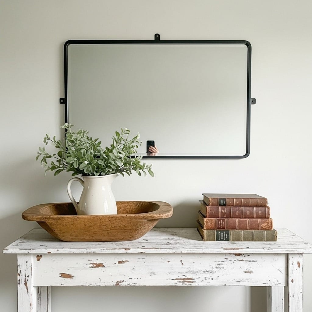Mix in vintage or vintage-inspired decor pieces. An old crock on the counter. A wire basket for storing throw blankets. Mason jars as bathroom storage. Galvanized metal accents like buckets or trays. These accessories bring in that collected-over-time quality and add personality without requiring precision or perfection. Thrift stores and flea markets are goldmines for this type of decor, and the hunt for pieces is part of the fun.