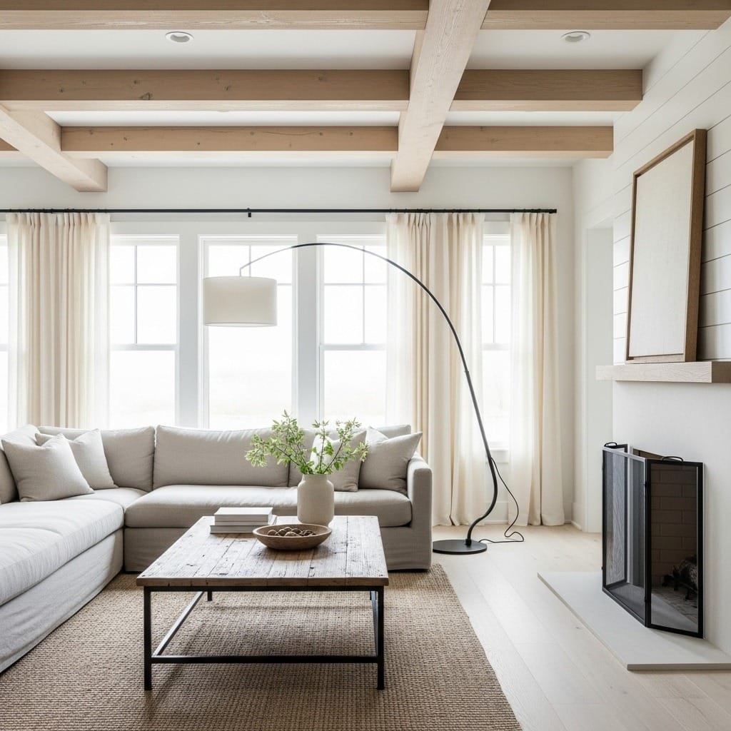 Texture plays a huge role here. A chunky knit throw draped over the sofa. A jute rug layering over hardwood floors. Linen pillows mixed with canvas. These tactile elements add warmth and visual interest without needing bold patterns or colors. The mix of rough and smooth, matte and slightly worn, creates depth that keeps neutral spaces from feeling sterile. This layering technique works especially well in open concept living room layouts.