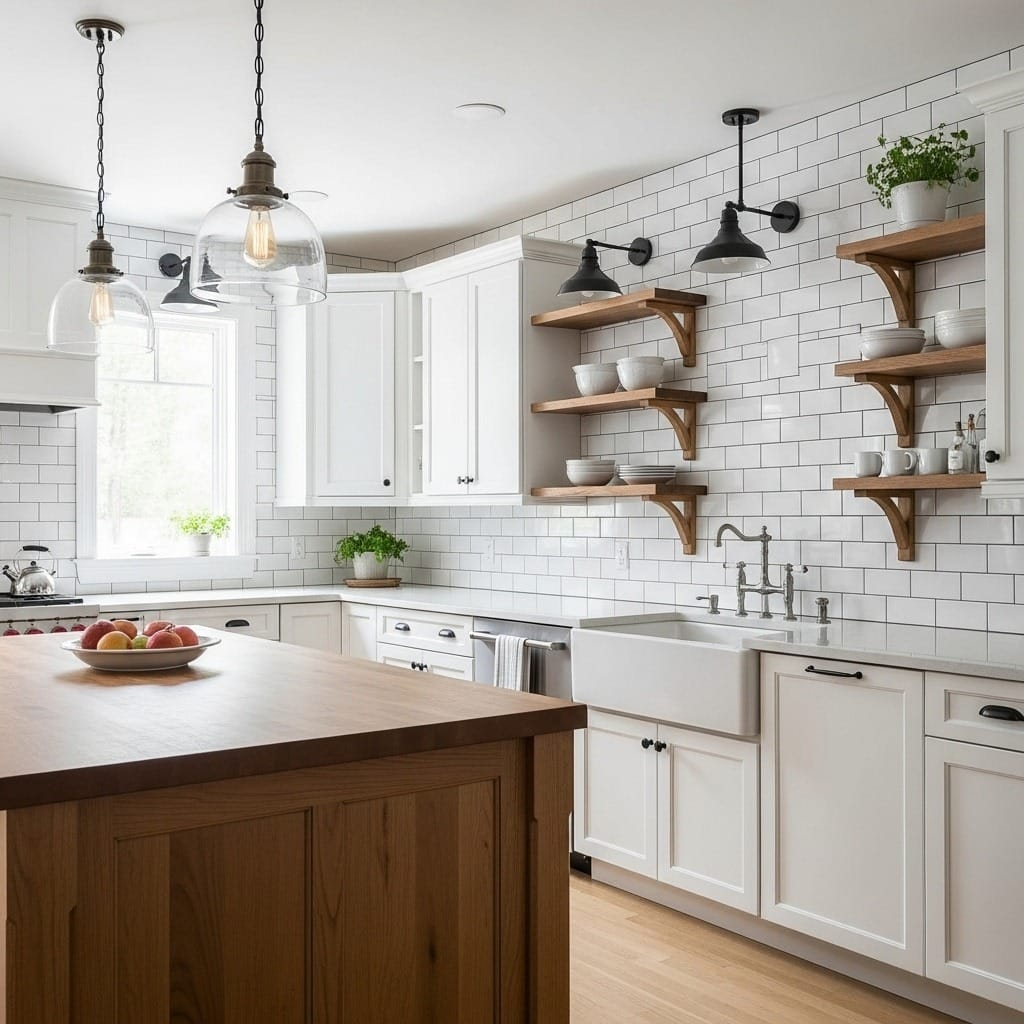 Open shelving has become almost expected in farmhouse kitchens. Replacing a few upper cabinets with open shelves lets you display everyday dishes, vintage crocks, or cutting boards. It breaks up the cabinetry and adds depth, though it does require keeping things organized since everything’s visible. Many people do a hybrid approach – open shelves on one wall, closed cabinets everywhere else. According to The Spruce, this mix of open and closed storage is one of the most practical aspects of the style.